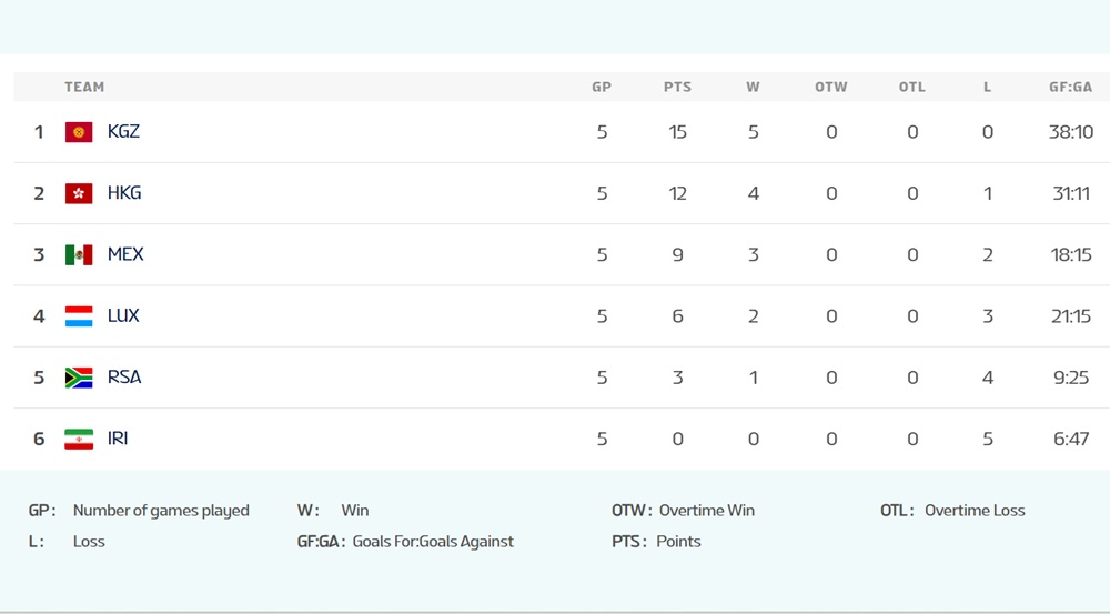 Сборная Кыргызстана по хоккею поочерёдно обыграла Гонконг (4:1), ЮАР (7:2), Иран (15:1) и Люксембург (5:2), а в заключительном матче турнира удержала первое место, победив Мексику со счётом 7:4. В следующем году Кыргызстан U-20 сыграет уровнем выше — в группе A Дивизиона III. Среди соперников ожидаются Таиланд, Турция, Бельгия, Болгария, а также команда, которая опустится из группы B Дивизиона II — Исландия.